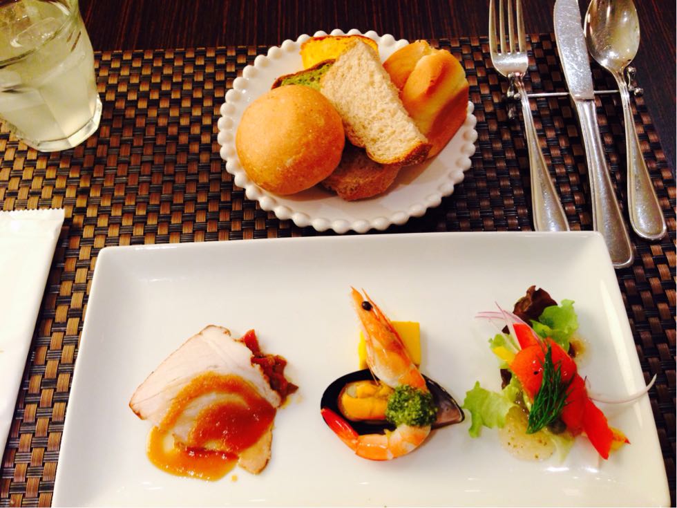 料理はコースでブレットバーとドリンクバーがついていました。最初の一品
