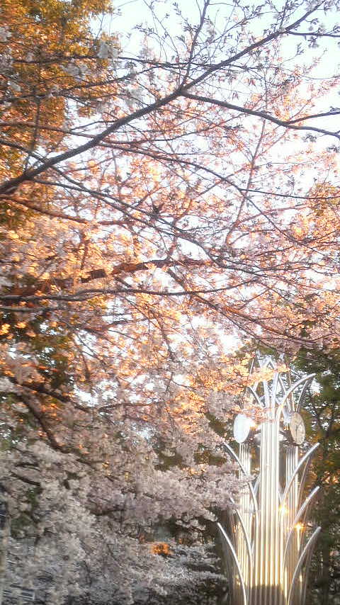 正門のところの夕日に照らされてとても綺麗だった桜の写真を載せておきたいと思います。