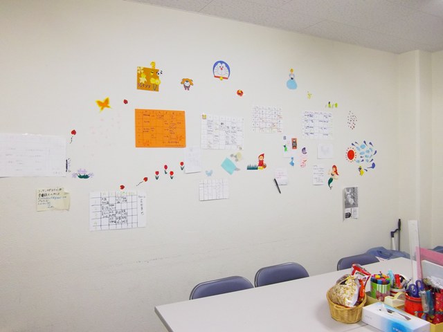 壁。ちょっと幼稚園とかみたいね笑 みんなの時間割とか貼ってます。その他連絡事項とか、掲示板的な役割も果たしてます。とりま、一回生、みんなも貼って時間割ww