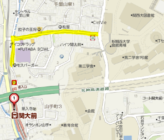 配布場所:阪急電鉄千里線「関大前」駅 北改札口~関大正門(地図画像の黄色く色を付けたエリア)